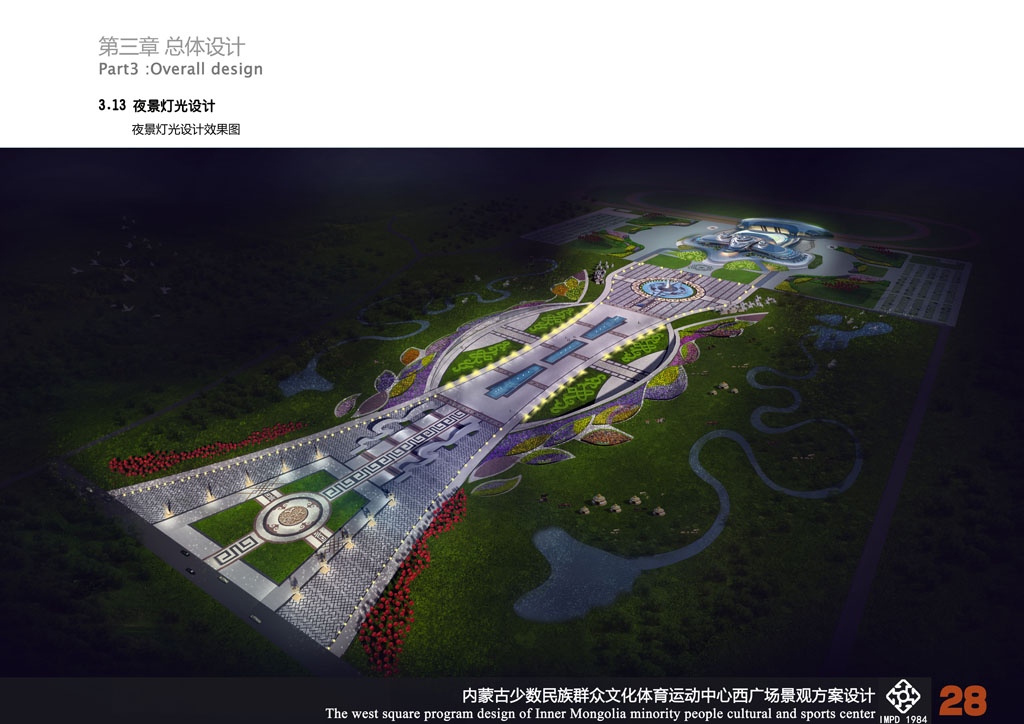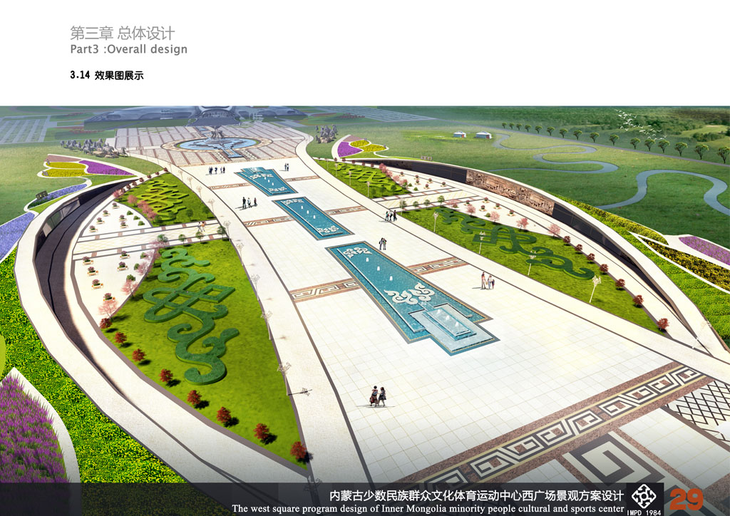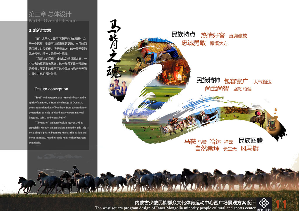 設(shè)計(jì)《馬背之魂》的靈感來(lái)源于馬鞍,馬鞍被草原人民譽(yù)為孕育民族搖籃的吉祥物。整個(gè)廣場(chǎng)景觀被設(shè)計(jì)為馬鞍型,場(chǎng)地兩側(cè)和中央入口景觀軸是鞍橋、鞍墊、夾墊、鞍韂和腳蹬,展示出草原“馬背之魂”的氣勢(shì)和氣魄,寓意自治區(qū)及全區(qū)人民吉祥如意。同時(shí),場(chǎng)地入口處設(shè)計(jì)了馬頭琴造型,兩側(cè)是哈達(dá)及迎賓歌舞等雕塑,表達(dá)出草原人民熱情好客的情懷;會(huì)場(chǎng)周邊是“馬圖騰” 和“萬(wàn)馬奔騰”群雕,進(jìn)一步突出蒙古族豐富多彩的“馬文化”。