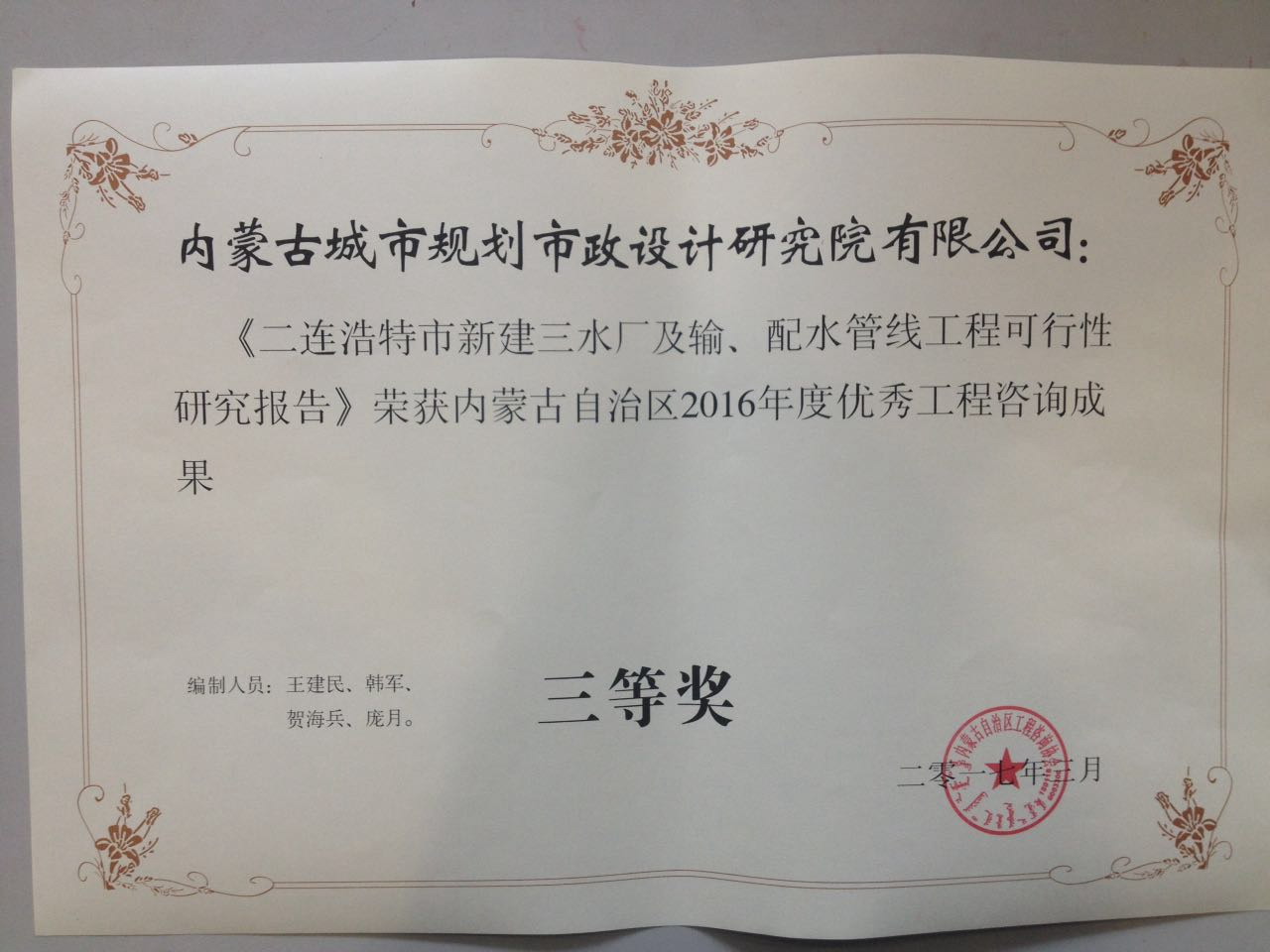 自治區(qū)2016年度優(yōu)秀咨詢成果獎名單揭曉,我院市政一所設(shè)計的《通遼市開魯縣工業(yè)園區(qū)污水處理及中水回用工程》、《二連浩特市新建三水廠及輸、配水管線工程可行性研究報告》分別榮獲內(nèi)蒙古自治區(qū)優(yōu)秀工程咨成果二、三等獎。