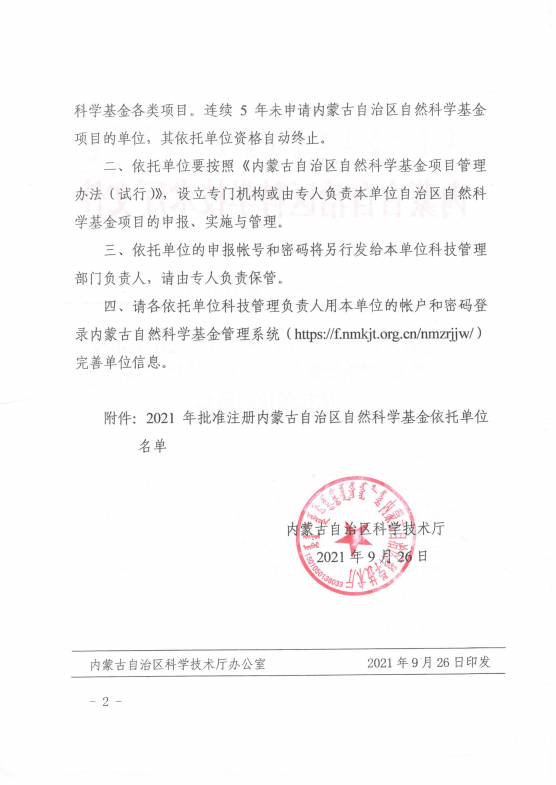 近日,內(nèi)蒙古自治區(qū)科學(xué)技術(shù)廳發(fā)布了《關(guān)于2021年度批準(zhǔn)注冊內(nèi)蒙古自治區(qū)自然科學(xué)基金依托單位的通知》,我院首次被批準(zhǔn)成為內(nèi)蒙古自治區(qū)自然科學(xué)基金依托單位,標(biāo)志著我院具備了獨自申請和承擔(dān)自治區(qū)自然科學(xué)基金項目的資格。
