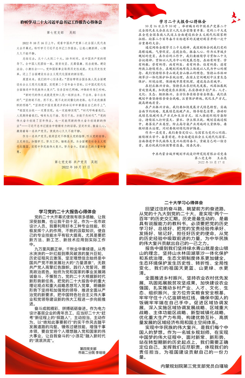 疫情雖然阻擋了大家的腳步,但是阻擋不了各位黨員同志收看的熱情。收聽收看過程中,內(nèi)蒙古規(guī)劃院黨員干部聚精會神地聆聽習(xí)近平總書記重要講話,倍受鼓舞、倍感振奮、倍增信心,不時用筆記下報告中的金句。大家紛紛表示,習(xí)近平總書記所作的大會報告凝聚人心、催人奮進,尤其是涉及到增進民生福祉,提高人民生活品質(zhì)方面,提出的一系列舉措,讓我們對今后的工作和生活更有盼頭;涉及到推動綠色發(fā)展,促進人與自然和諧共生,推進生態(tài)優(yōu)先、節(jié)約集約、綠色低碳發(fā)展方面,與我們的工作息息相關(guān),作為新時代設(shè)計師,我們要在清潔能源、生態(tài)修復(fù)、低碳建筑等方面大膽創(chuàng)新、銳意進取,為建設(shè)亮麗內(nèi)蒙古貢獻專業(yè)力量。我們將以此為契機,學(xué)深悟透習(xí)近平總書記重要講話精神,要繼續(xù)堅定不移跟黨走。作為一名黨員技術(shù)人員,要在做好本職工作的同時,不斷加強學(xué)習(xí),提升專業(yè)技術(shù)能力和科研水平,為推動全院各項工作再上新臺階貢獻力量。