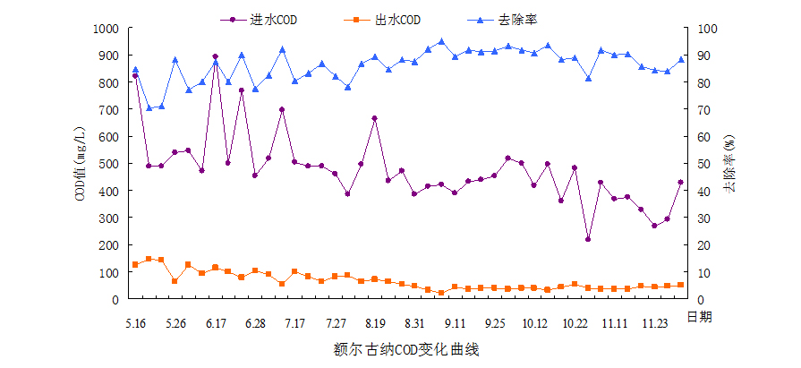 上圖顯示調(diào)試期間COD的變化趨勢(shì)以及去除率變化曲線,污泥馴化結(jié)束后15天時(shí)間內(nèi),COD去除率可達(dá)到70%以上。經(jīng)過近3個(gè)月的調(diào)整,自8月中下旬起出水COD值維持在60mg/L以下,平均去除率穩(wěn)定在89%以上并持續(xù)保持良好穩(wěn)定的去除效果。