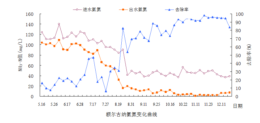 上圖顯示,5月調(diào)試初期由于進(jìn)水氨氮值較高,系統(tǒng)水溫較低,基本保持在10℃以下,氨氮去除效果并不明顯。7月中旬后,水溫持續(xù)上升,8月下旬基本達(dá)到理想處理效果。在9月氣溫開始回降,至10月末降至10℃以下的情況下,系統(tǒng)仍然保持良好穩(wěn)定的去除效果?;揪S持平均出水氨氮值6mg/L,平均去除率穩(wěn)定在87%。這說明,系統(tǒng)的硝化細(xì)菌在適宜溫度培養(yǎng)成熟后,在3到5個(gè)月內(nèi)能逐漸適應(yīng)低溫。隨著異養(yǎng)菌去除有機(jī)物能力的提高和反應(yīng)池生物量的提高,硝化菌逐步得到富集,硝化效果逐步穩(wěn)定。在好氧反應(yīng)階段,反應(yīng)池穩(wěn)定的低負(fù)荷、高濃度運(yùn)行確保良好的硝化效果;在缺氧階段硝態(tài)氮能夠快速利用短時(shí)段進(jìn)水補(bǔ)充的碳源進(jìn)行反硝化,利用單周期多步進(jìn)水有效提高反硝化碳源補(bǔ)給率,從而保證脫氮效果。